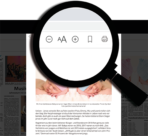 Innerhalb der Artikelansicht können Sie über die Regler die Schriftgröße nach Ihren Wünschen ändern und den ausgewählten Artikel drucken.